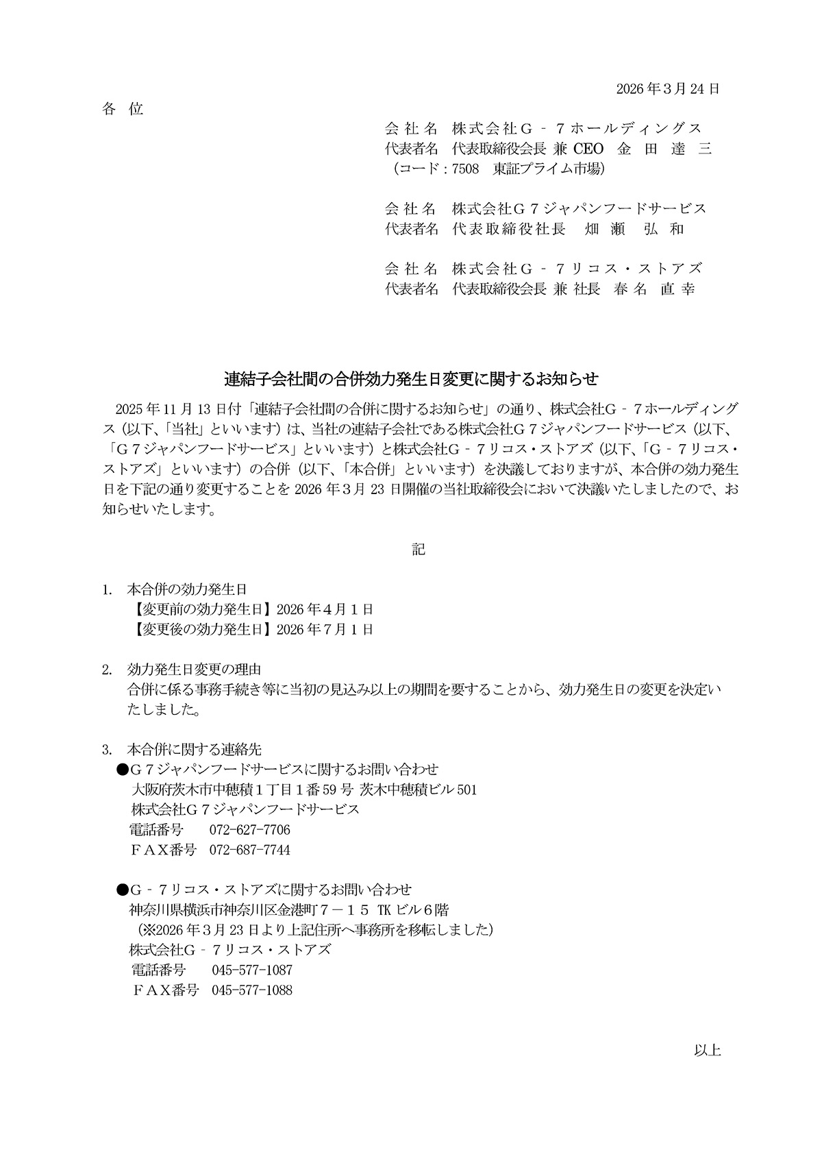 連結子会社間の合併効力発生日変更に関するお知らせ