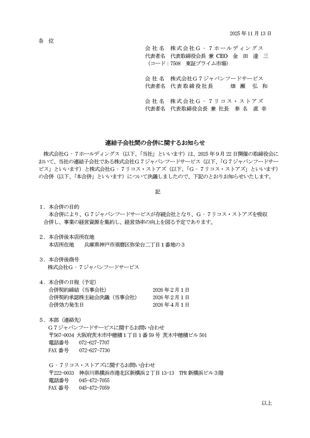 連結子会社間の合併に関するお知らせ (株)G7ジャパンフードサービスと(株)G-7リコス・ストアズ
